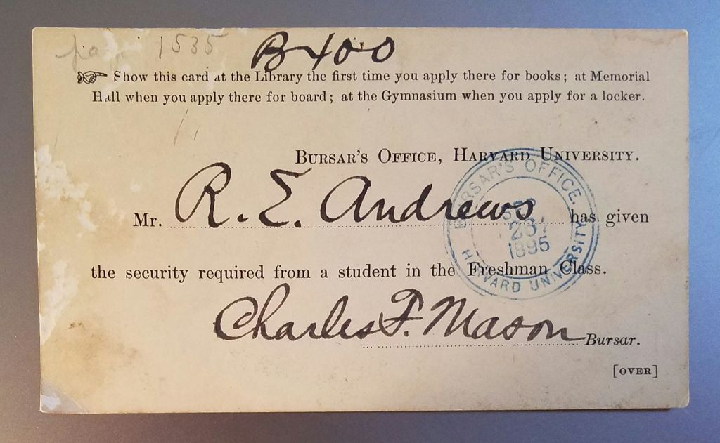 1895 Harvard University Bursar’s Office Freshman Security Receipt issued to R. E. Andrews