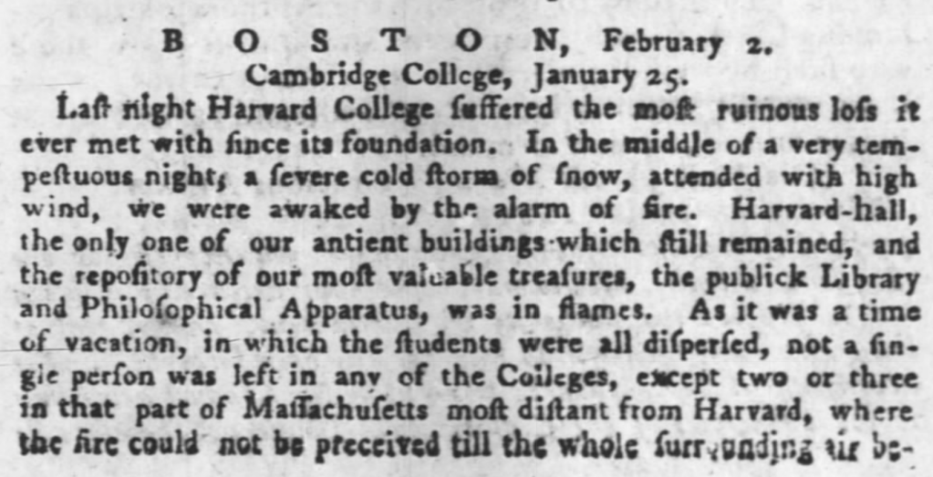 In 1676, The Library moved to Harvard Hall, where it remained for nearly 100 years until the building and library collection was destroyed by fire in 1764.