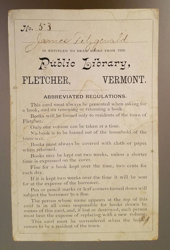 1896 Fletcher Public Library Card No. 53 issued to James Fitzgerald