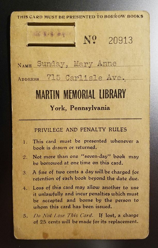 Martin Memorial Library Card No. 20913 Issued to Mary Anne Sunday (front)Martin Memorial Library Card No. 20913 Issued to Mary Anne Sunday (back)