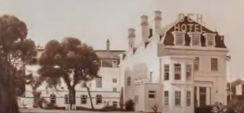 The card is addressed to Mrs. P. De la Mare at Fairholme, Ann’s Place, St. Peter Port, which is the address of The Old Government House Hotel. Built in the early eighteenth century as a home for a local merchant, the house was purchased by the Channel Islands’ government in 1797 to serve as the home of the Lieutenant Governor. In 1857, the home was sold and began operation as the Old Government House Hotel. During the German occupation, the hotel was used a base for German officers, and in 1941, became a soldiers’ home for the remainder of the war. The hotel continues to operate today as a 5-star hotel.