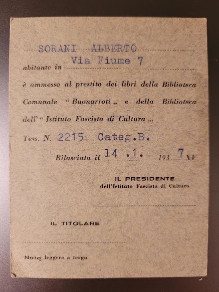 Pre-1937 Istituto Fascista di Cultura Biblioteca Library Card N.641, Issued to Alberto Sorani