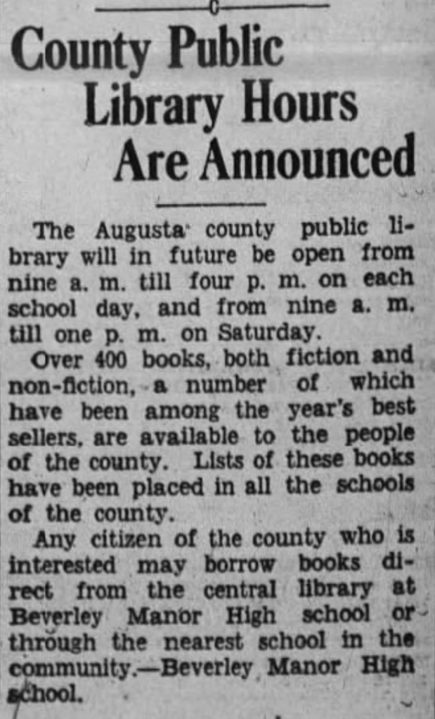 The opening of the Augusta County Library in Fishersville, Virginia was announced in the Daily News Leader, on July 14, 1939. Located in the Beverly Manor Elementary School, the public library was open to all “county folk.” The library held approximately 1,400 volumes for all ages. Miss “Lina” Hupman was the librarian. The initial hours were Sunday through Friday, from 9:00 am to 4:00 pm; however, due to robust attendance, Saturday hours (9:00 am to 1:00 pm) were quickly added and announced in The Daily News Leader, October 28, 1939.