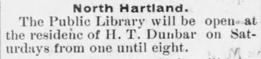 Notice re Business Hours at Hartland Four Corners Library, Vermont Standard, July 22, 1897, Page 4 (Woodstock, Vermont)