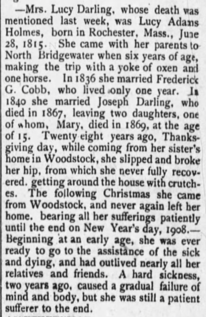 Lucy Adams Holmes Darling obituary from the Vermont Journal, Windsor, Vermont, January 18, 1908, Page 4