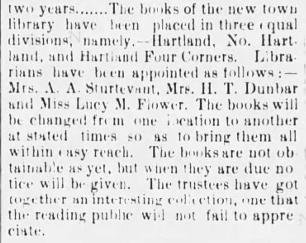 In 1896, the Hartland Public Library opened three “divisions” in Hartland, North Hartland and Hartland Four Corners. As reported in the Vermont Journal, October 24, 1896, Louise R. (Mrs. Albert A.) Sturtevant (1843-1933), Jennie J. {Mrs. Henry T.} Dunbar (1867-1941), and Miss Lucy M. Flower (1875-1900), were appointed as the division librarians, and each provided an area or room in their homes for use as the library of their particular division. 900 volumes were divided amongst the three divisions to be rotated on a quarterly basis.