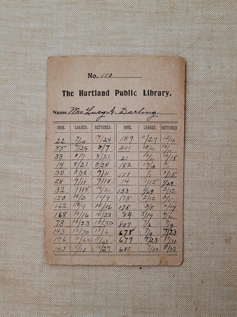 The Hartland Public Library Card No. 110 issued to Mrs. Lucy A. Darling (front)The Hartland Public Library Card No. 110 issued to Mrs. Lucy A. Darling (back)The Hartland Public Library Card No. 110 issued to Mrs. Lucy A. Darling (front)The Hartland Public Library Card No. 110 issued to Mrs. Lucy a. Darling (back)The Hartland Public Library No. 354 issued to Mrs. L. V. Gilbert (front)The Hartland Public Library No. 354 issued to Mrs. L. V. Gilbert (back)1896-1899 Library Cards for The Hartland Public Library