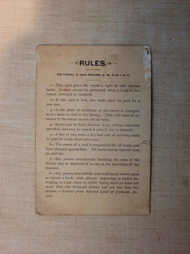 Apparently, library services were in such demand that Lucy M. Flower, the librarian of the Four Corners division, found it necessary to post a notice in the Vermont Standard newspaper that visiting the library outside the posted hours of 1pm-8pm on Saturdays is no longer allowed.