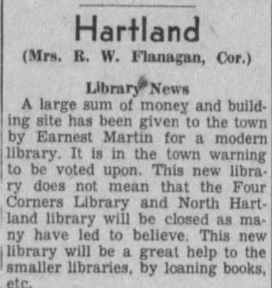 In 1958, Earnest N. Martin (1874-1965), a local lumber and saw mill operator, built the Martin Memorial Building and donated the building for use a the new Hartland Public Library.