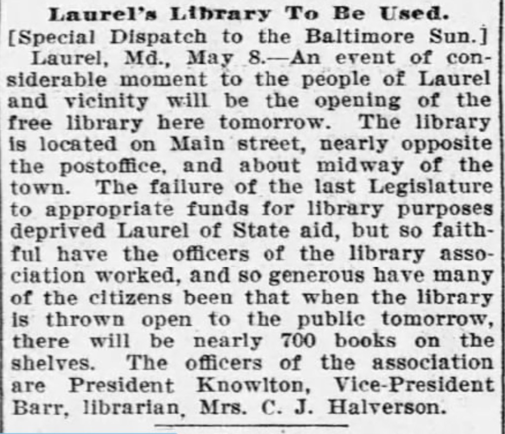 “Laurel’s Library to Be Used,” The Baltimore Sun, May 9, 1910, Page 11