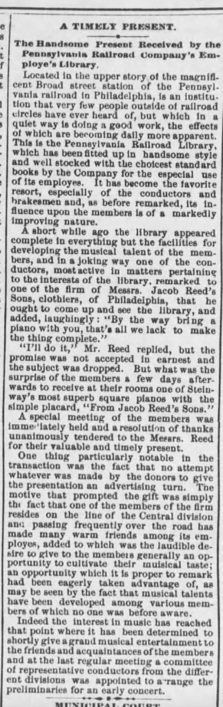 One such reading room was located on the “upper story” of PRR’s Broad Street Station located at Broad and Market Streets in Philadelphia (now John F. Kennedy Blvd. and W. 15th Street). Opened on December 5, 1881, it was the primary passenger terminal for the PRR from 1881 to the 1950s.