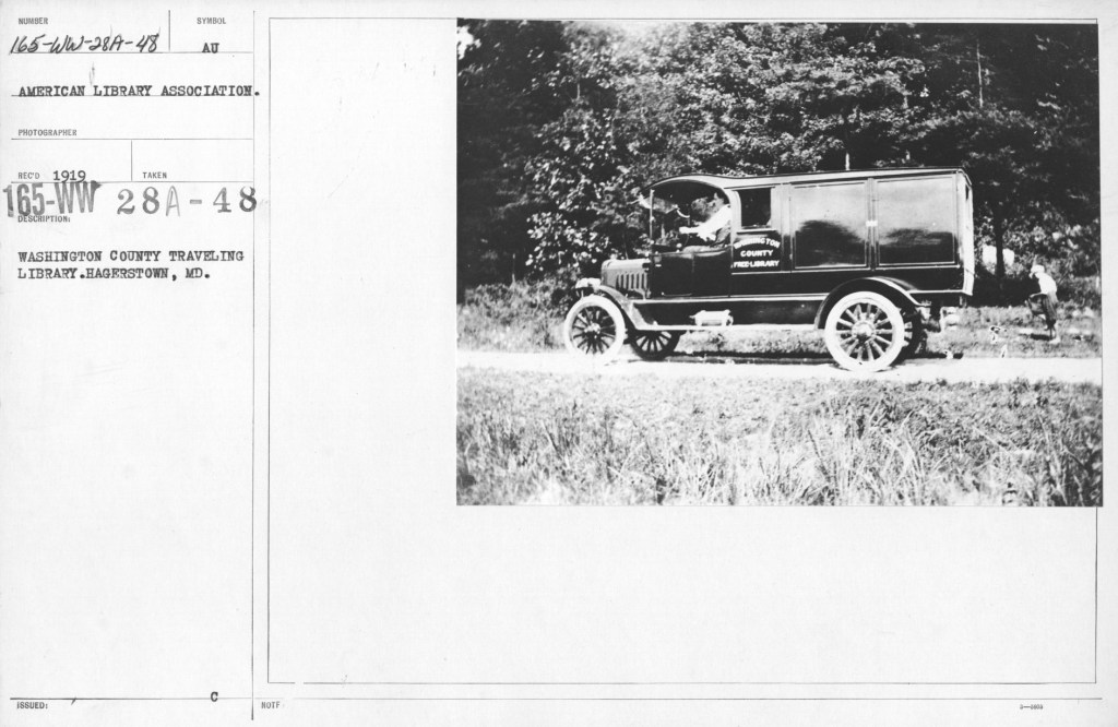 Free traveling library in Hagerstown, Maryland Courtesy The National Archives Catalog. Photographer: American Library Association. No copyright restrictions.