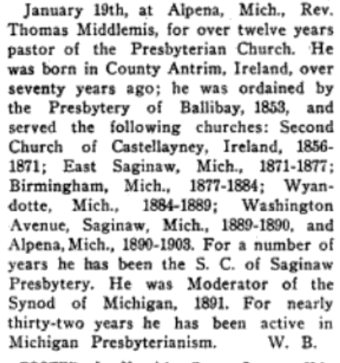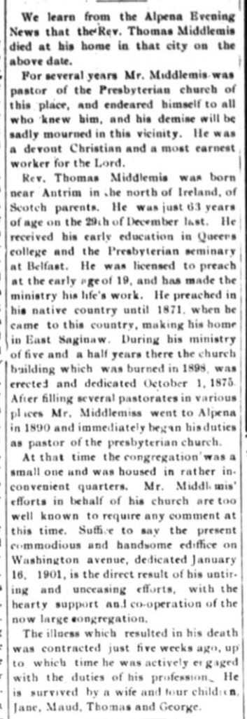 Rev. Thomas Middlemis was born in Belfast, Ireland on December 28, 1839. According to Thom’s Almanac and Official Directory for the United Kingdom of 1859, he was associated with the Ballibay Presbytery of Castleblayney. On August 7, 1866, he married Jeannie Coulter who ten months later on June 3, 1867 at Killycard Cottage in Castleblayney, Ireland. In 1871, Rev. Middlemis immigrated to the United States. He married Jane Burns (born 1842-1926) April 25, 1872. They had three children, George Ross (1883–1949), Alice Maud (1875–1904), and Thomas, Jr. (1875–1928). The Middlemis family lived at 114 E. Maple in Alpena Michigan until his death from heart failure due to pneumonia on January 19, 1903. Rev. Middlemis, Jane Burns, Alice Maud and Thomas, Jr. are buried in the Evergreen Cemetary in Alpena, Michigan.