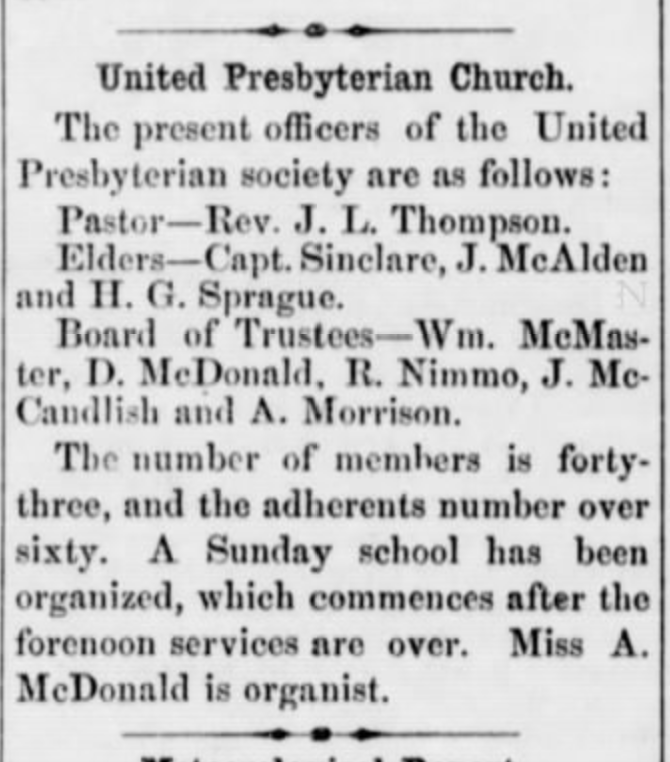 New article from the Alpena Argus (Alpena, Michigan), Wednesday, January 14, 1885, Page 3, announcing the opening of the new United Presbyterian Church on Washington Avenue in Alpena