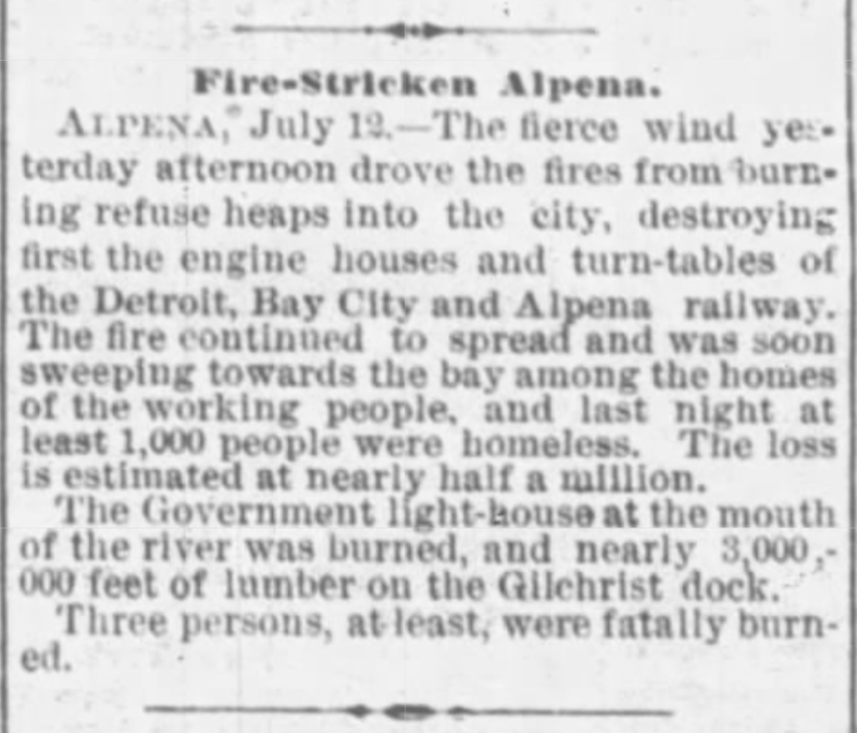 Most of Alpena was destroyed in the Great Michigan Fire of 1871, a series of simultaneous forest fires that burned 1.5 million acres and caused hundreds of deaths. Less than one year later, on July 12, 1872, another fire destroyed 15 acres of homes and businesses. The damages amounted to at least $250,000 (equal to nearly $6M in 2022), at least three people were killed, and hundreds were left homeless. Alpena was again hit by a disastrous fire on July 11, 1888.