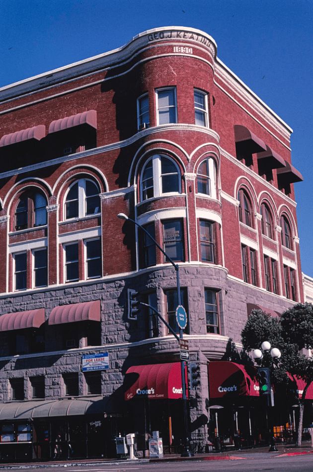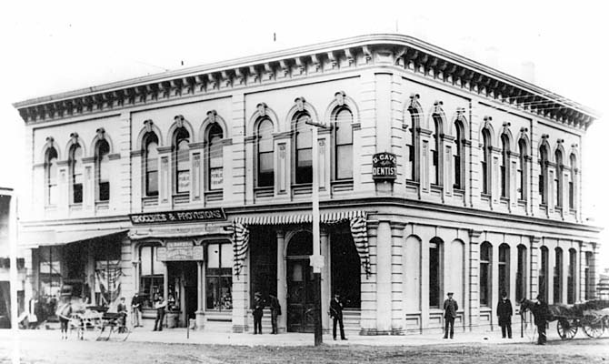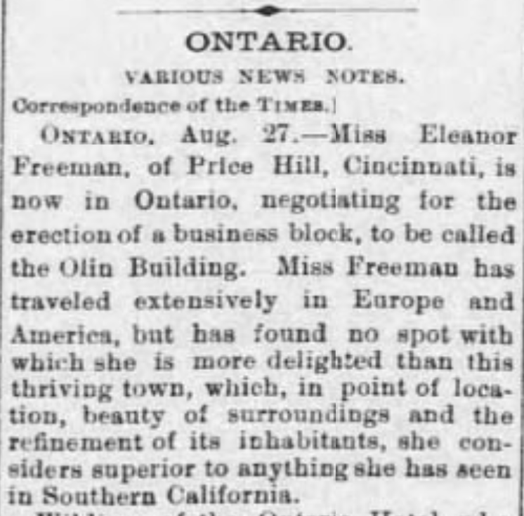 One of the earliest locations of the library was at the southwest corner of A Street (now Holt’s Boulevard) and Euclid Avenue in a 2-story brick building known as the Ohio Block. The Ohio Block was built by Miss Eleanor Freeman (1848-1904) in 1888. Freeman, originally from Cincinnati, Ohio, was so charmed by the weather in Ontario that a temporary three-week stay resulted in the purchase of a twenty-acre tract of land. Freeman and her niece, Mary Ellen Agnew (1851-1914), served as the first librarians.