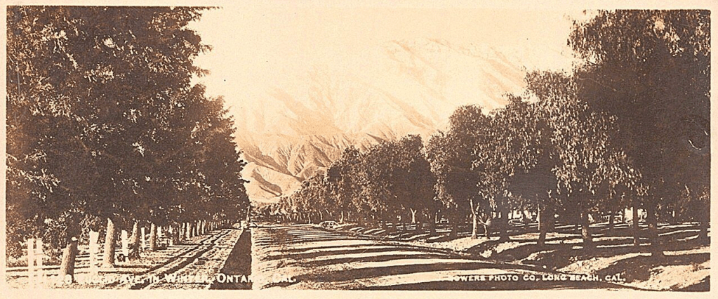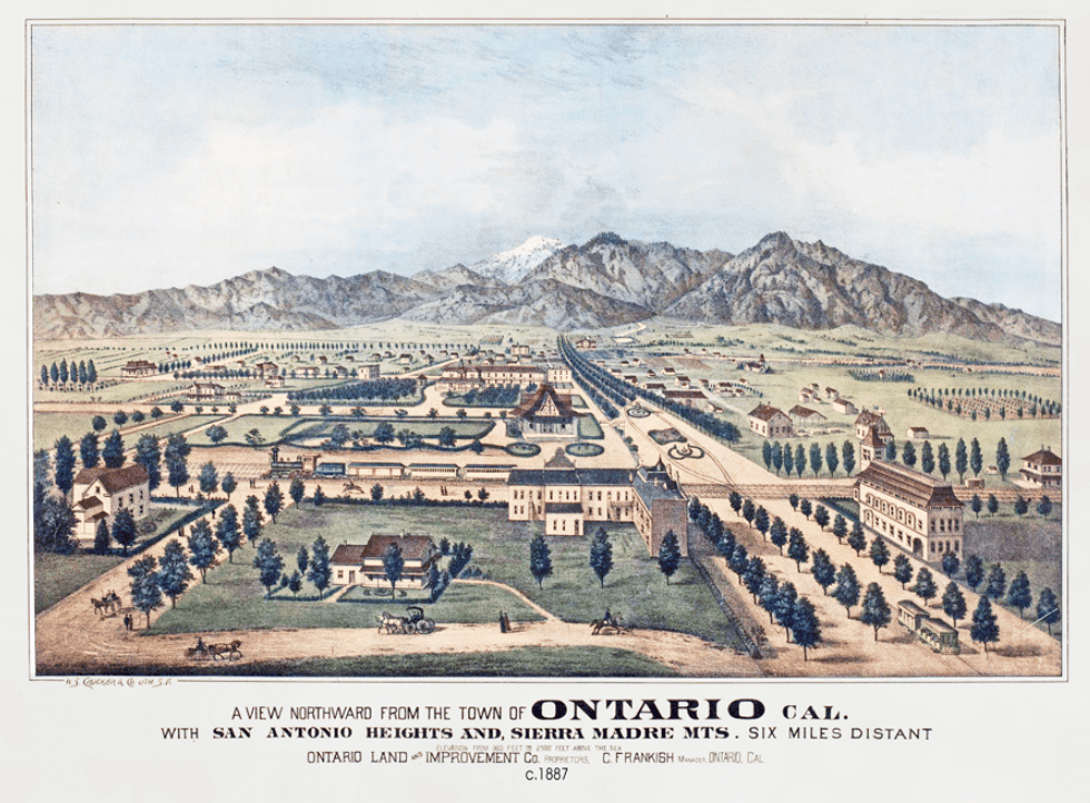 In 1881, brothers William B. (1856-1926) and George Chaffey, Jr. (1848-1938), both engineers from Brockville, Ontario, Canada, began purchasing parcels of land in Southern California with the intention of creating “irrigation colonies” complete with water resources, water-powered cable cars, grand avenues illuminated with electric lights, and convenient access to the existing Southern Pacific Railway. Those land purchases became the Etiwanda, Upland, and Ontario Settlements. Due to the mild winter climate and easy access to water from the nearby mountains, citrus farmers were some of the first landowners in Ontario.