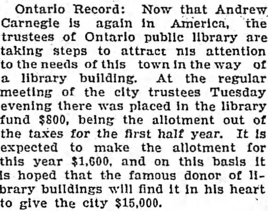 In 1903, the “Ontario Public Library” requested assistance from philanthropist Andrew Carnegie to secure funds for the construction of a new library building. In April 1906, after receiving a donation of $10,000 towards the project, the head librarian, Miss Kezzie A. Monroe, visited the Covina Public Library in California, which had opened in 1905. She gathered ideas from the library tour, and Architect F.P. Burnham was hired to prepare plans for the new Ontario library building. On April 13, 1907, the new library building located at D Street and Euclid Avenue opened, stocked with approximately 3,400 volumes with plenty of room for growth.