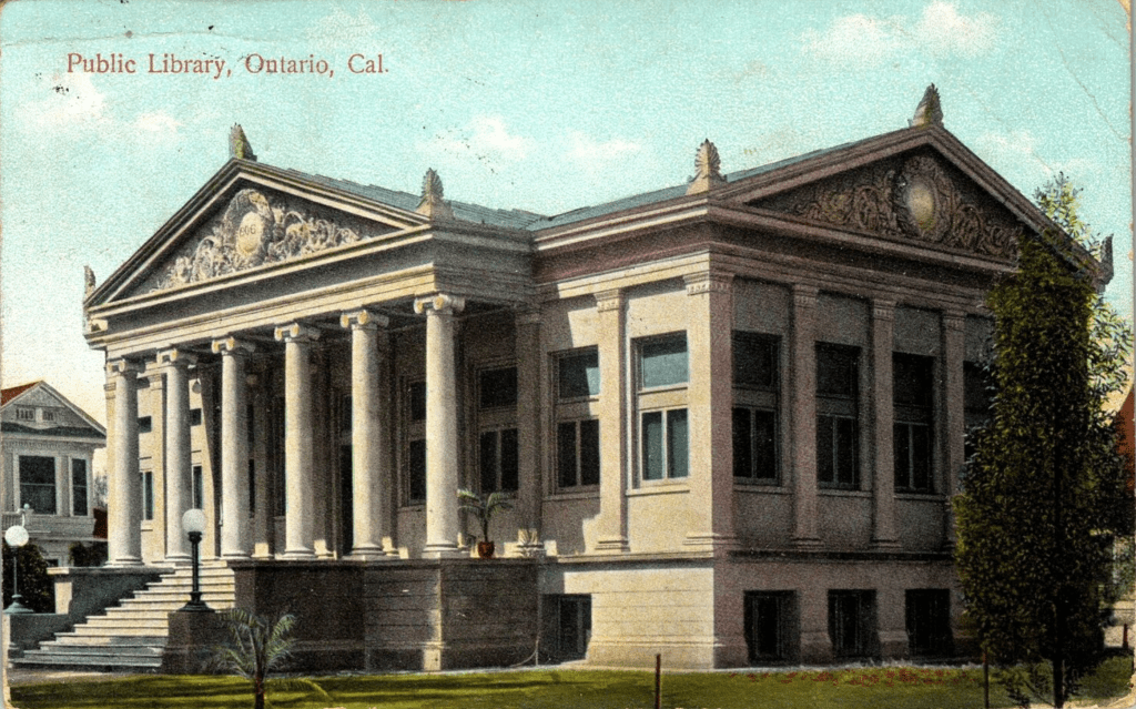 The Ontario City Library was established in 1885, according to Publication No. 3, “The Libraries of California in 1899”, which was published by the Library Association of California in April 1900. Although it was organized by the town of Ontario, the library earned its revenue through annual subscriptions of $1.00 and community fund-raising events, such as citrus fairs and concerts. Not until 1902 would the library become a free public library.