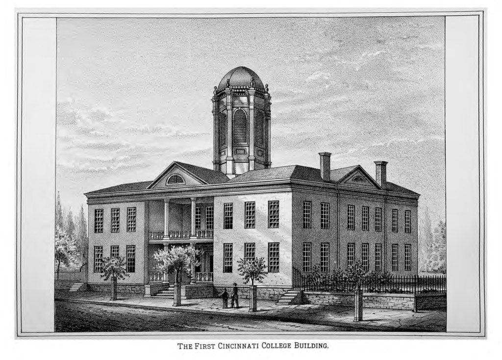Early etching by unknown artist of the First Cincinnati College Building. (No known copyright restrictions. Used in accordance with Title 17 U.S.C. Section 107 and the Doctrine of Fair Use)