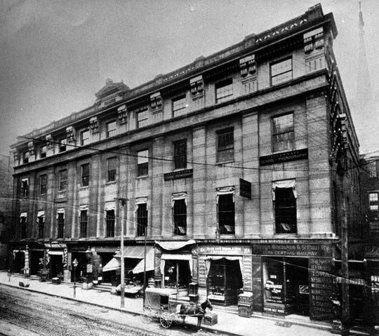 1890s photo by unknown photographer of Cincinnati College Bulidng on Walnut Street. (No known copyright restrictions. Used in accordance with Title 17 U.S.C. Section 107 and the Doctrine of Fair Use)
