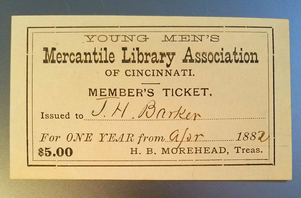 1882 Young Men’s Mercantile Library Association of Cincinnati Member’s Ticket (Circulation No. B. 69) Issued to J. H. Barker (front)1882 Young Men’s Mercantile Library Association of Cincinnati Member’s Ticket (Circulation No. B. 69) Issued to J. H. Barker (back)