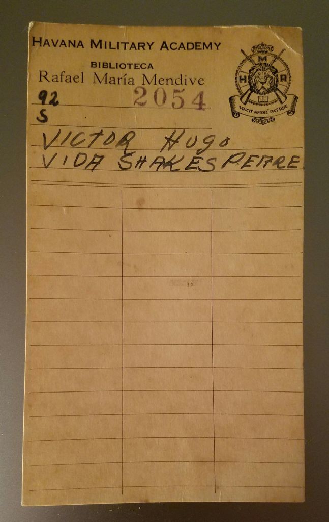 Pre-1960 Book Card for Victor Hugo’s biography of William Shakespeare, Havana Military Academy, Biblioteca Rafael Maria Mendive