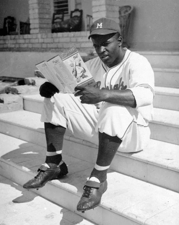 Jackie Robinson reading the 1947 Montreal Royals’ roster. (Associated Press/public domain)